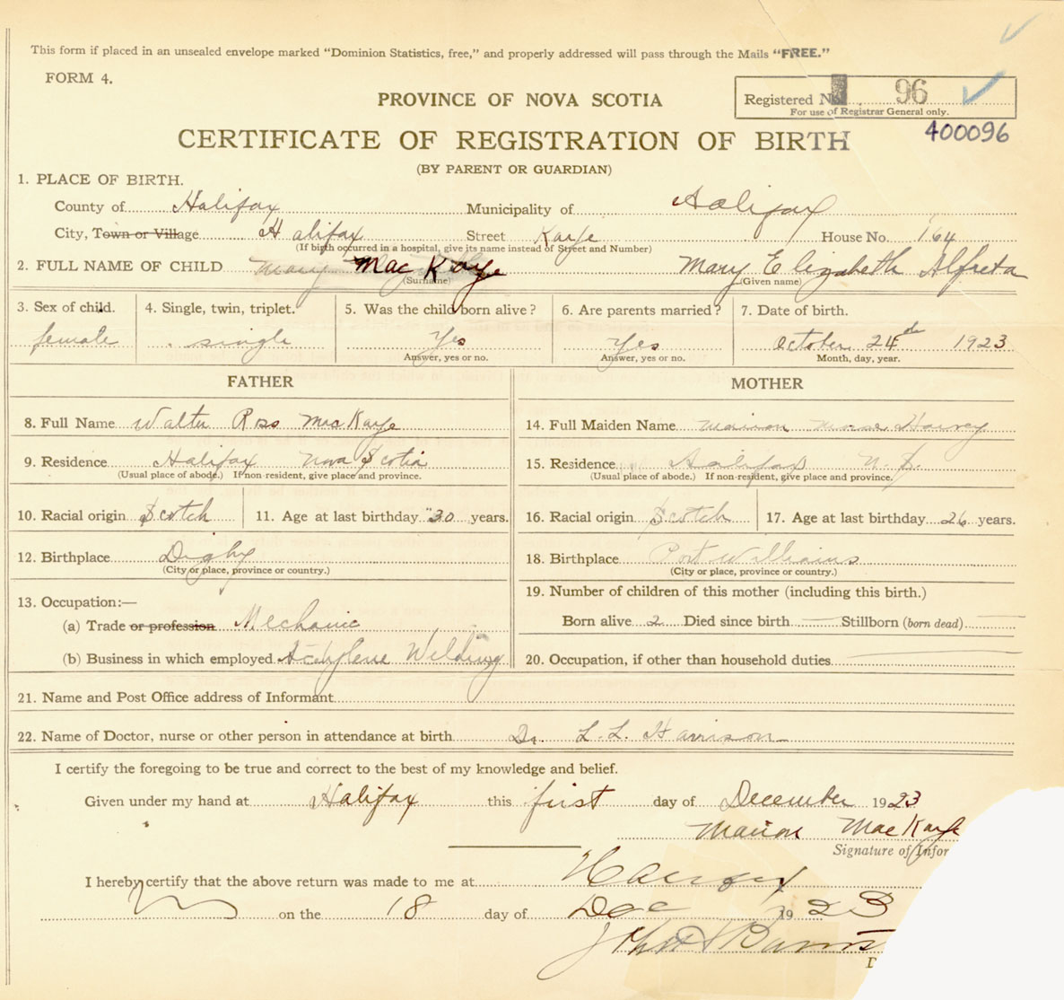 Female Birth Registration: Year: 1923 number: 40000096
