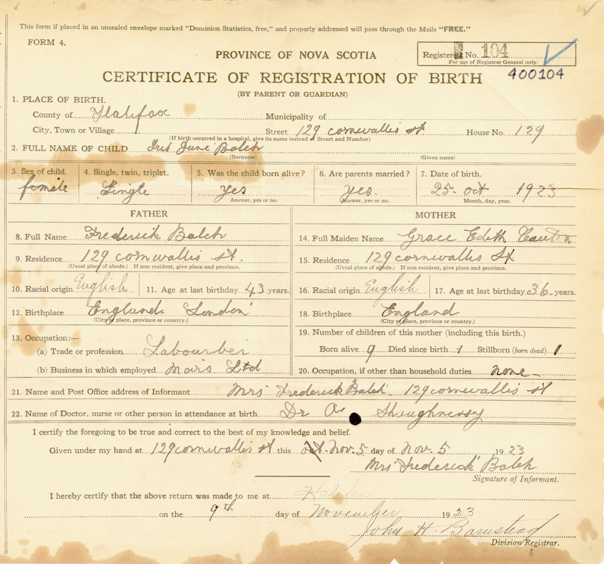 Female Birth Registration: Year: 1923 number: 40000104