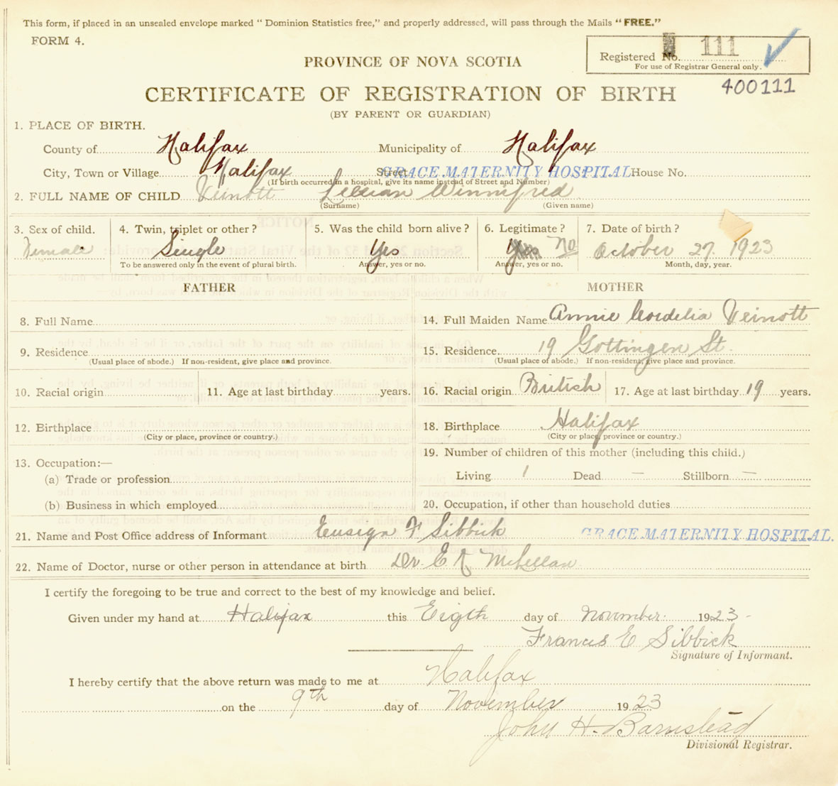 Female Birth Registration: Year: 1923 number: 40000111
