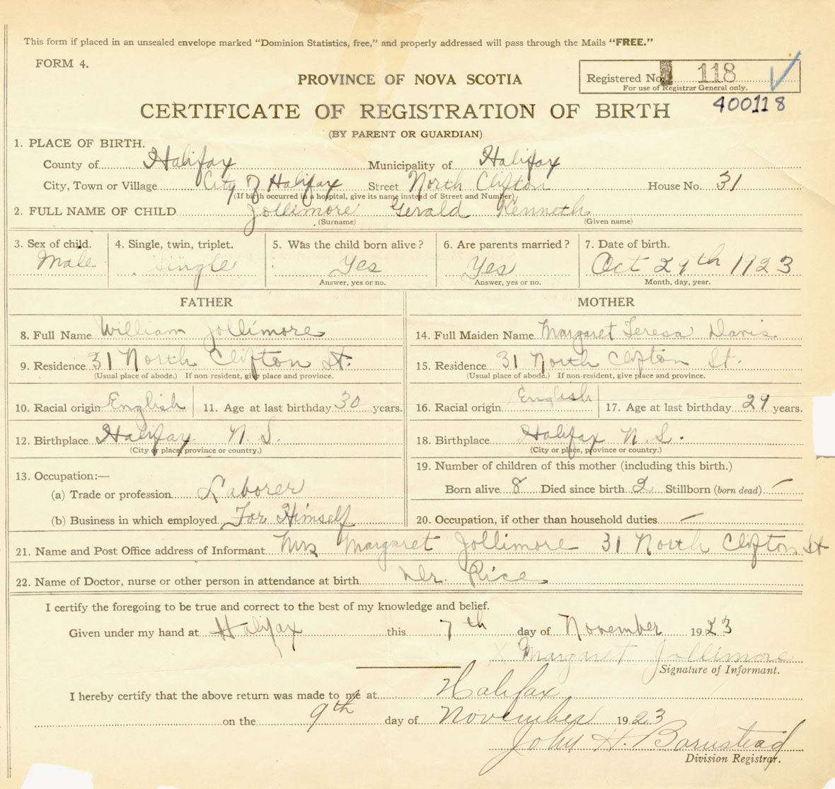 Male Birth Registration: Year: 1923 number: 40000118