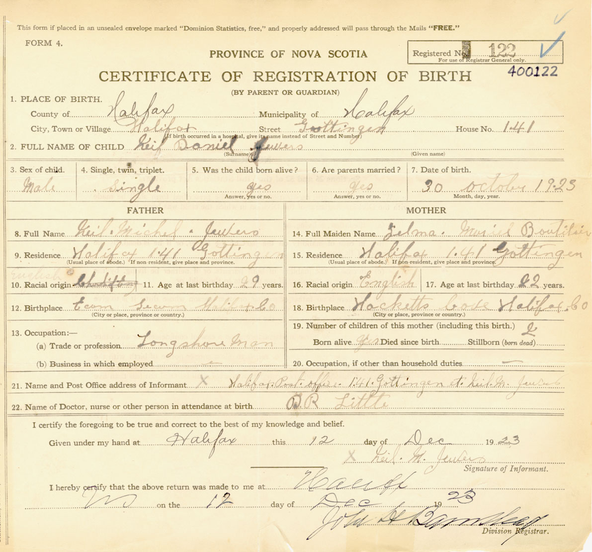 Male Birth Registration: Year: 1923 number: 40000122