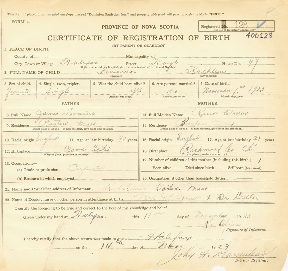 Female Birth Registration: Year: 1923 number: 40000128
