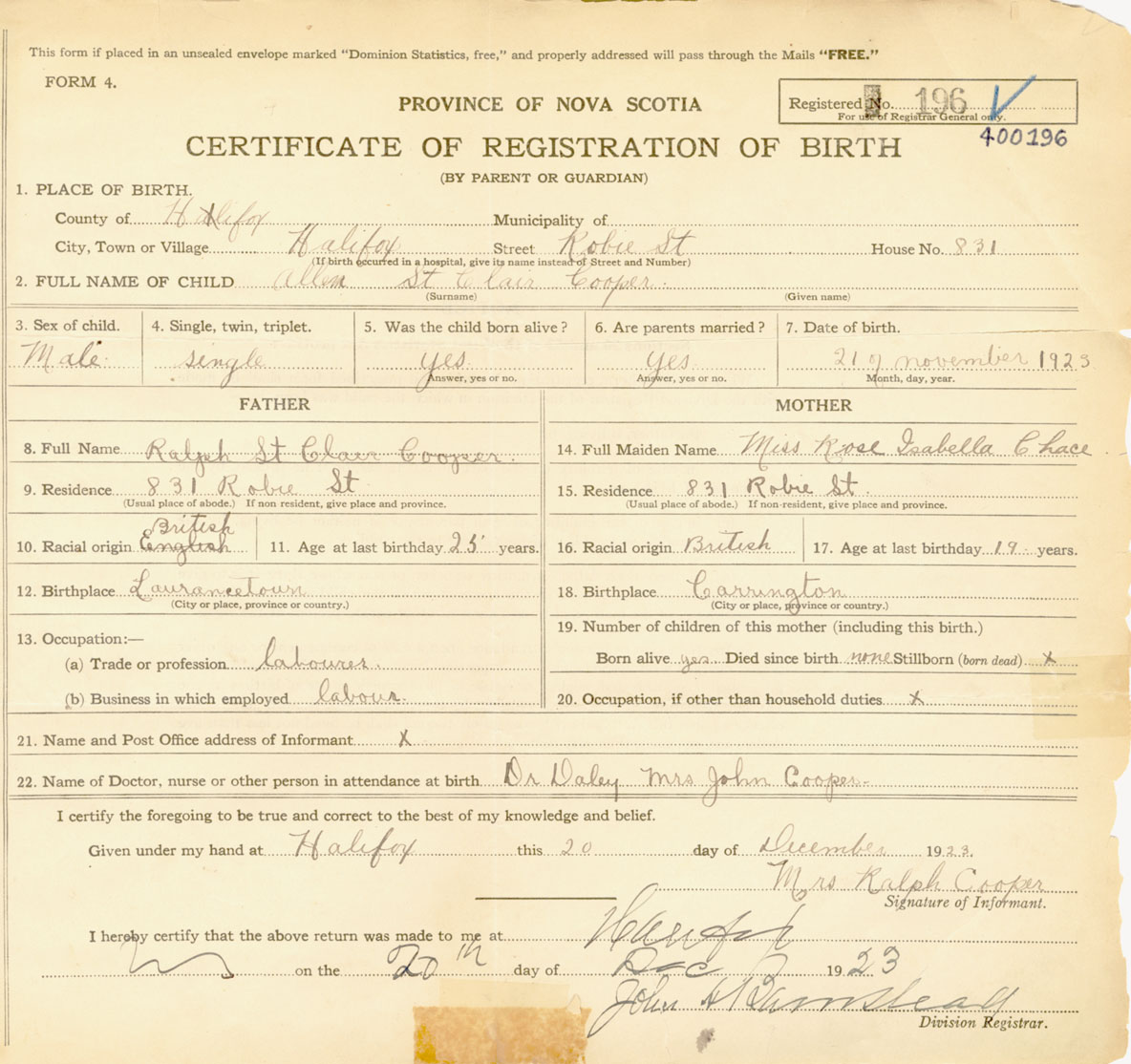 Male Birth Registration: Year: 1923 number: 40000196