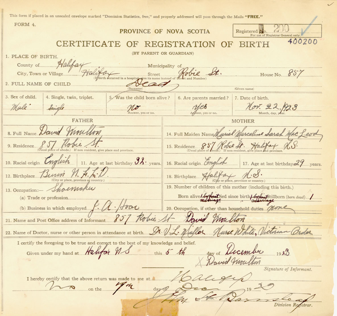 Male Birth Registration: Year: 1923 number: 40000200