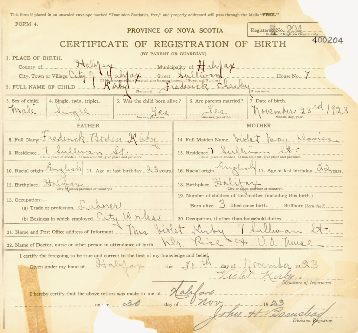 Male Birth Registration: Year: 1923 number: 40000204