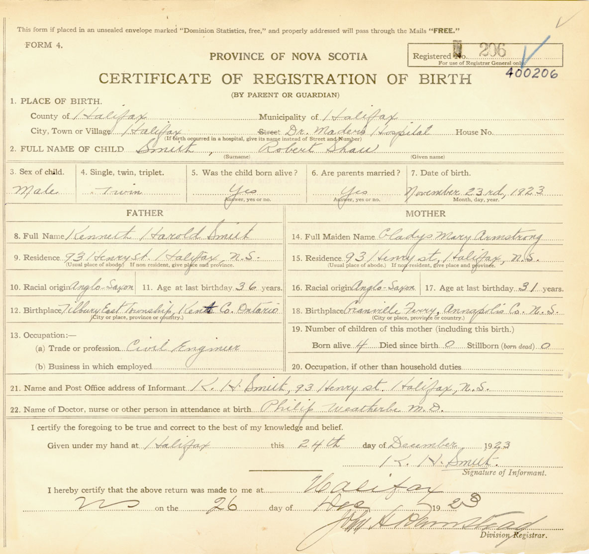 Male Birth Registration: Year: 1923 number: 40000206