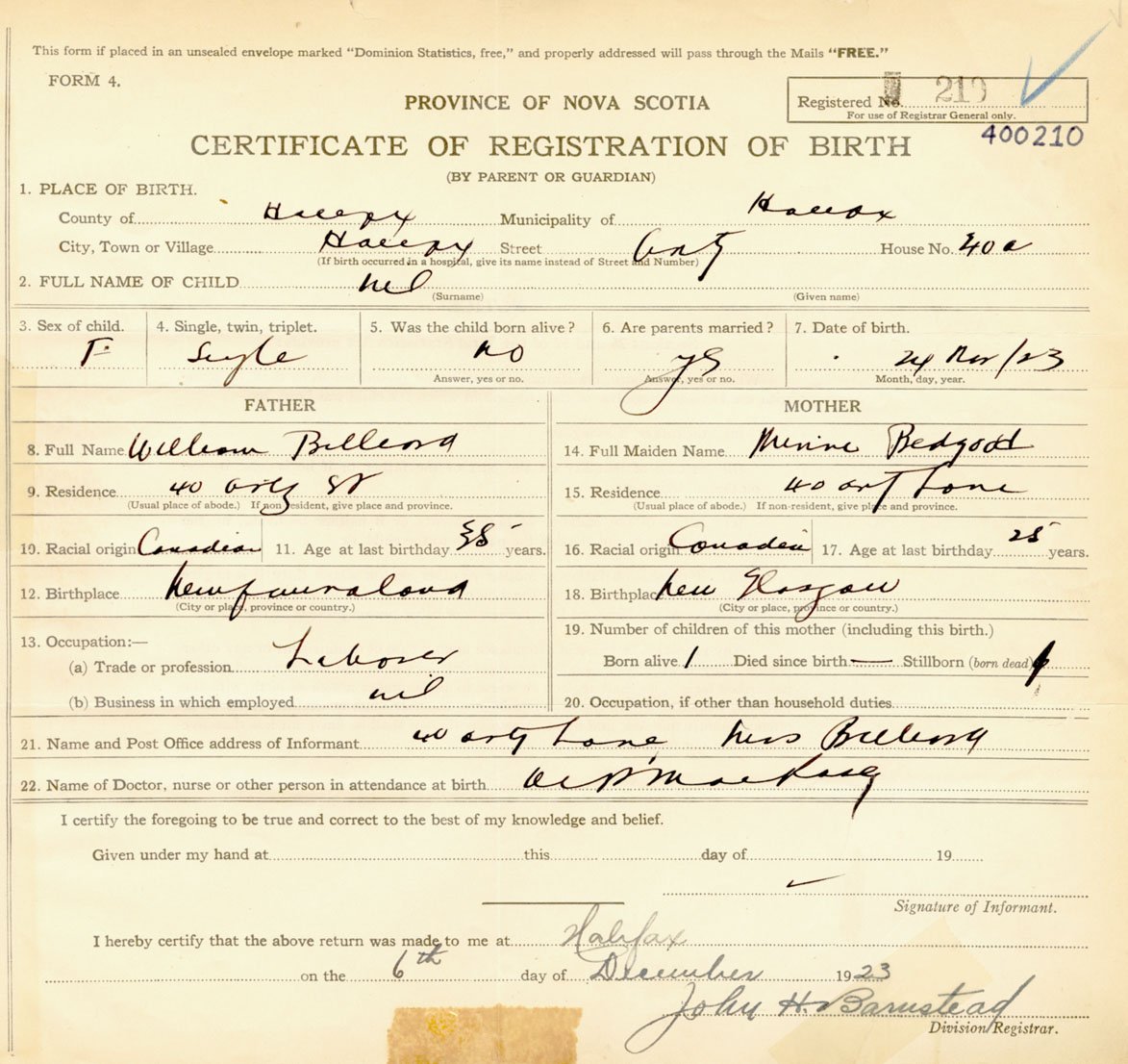 Female Birth Registration: Year: 1923 number: 40000210
