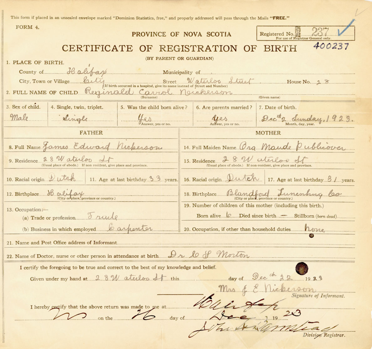 Male Birth Registration: Year: 1923 number: 40000237