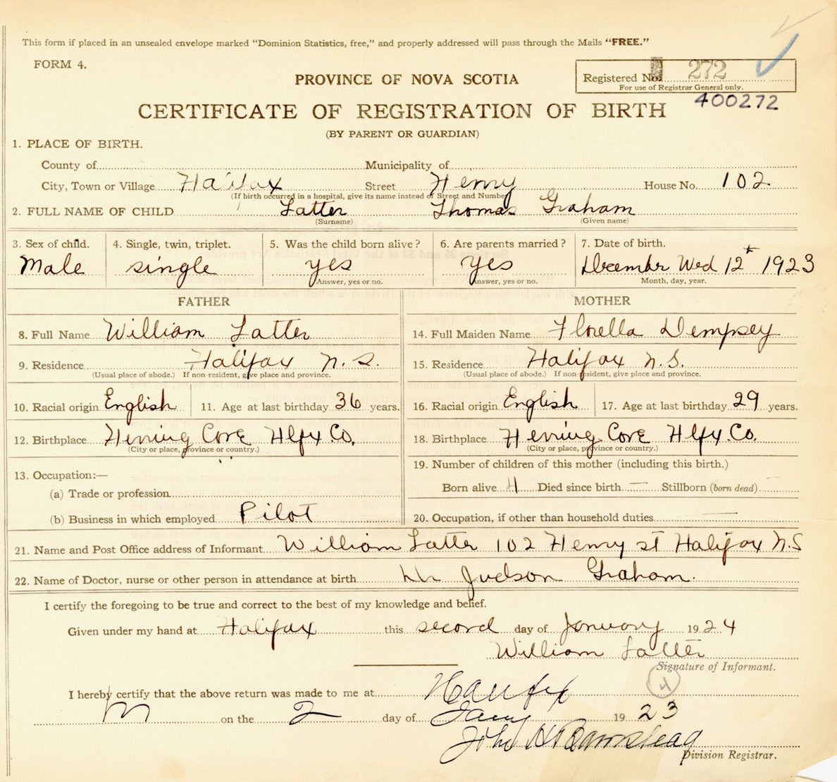 Male Birth Registration: Year: 1923 number: 40000272