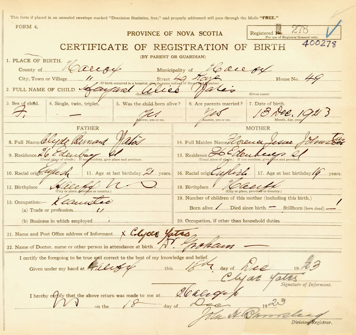 Female Birth Registration: Year: 1923 number: 40000278