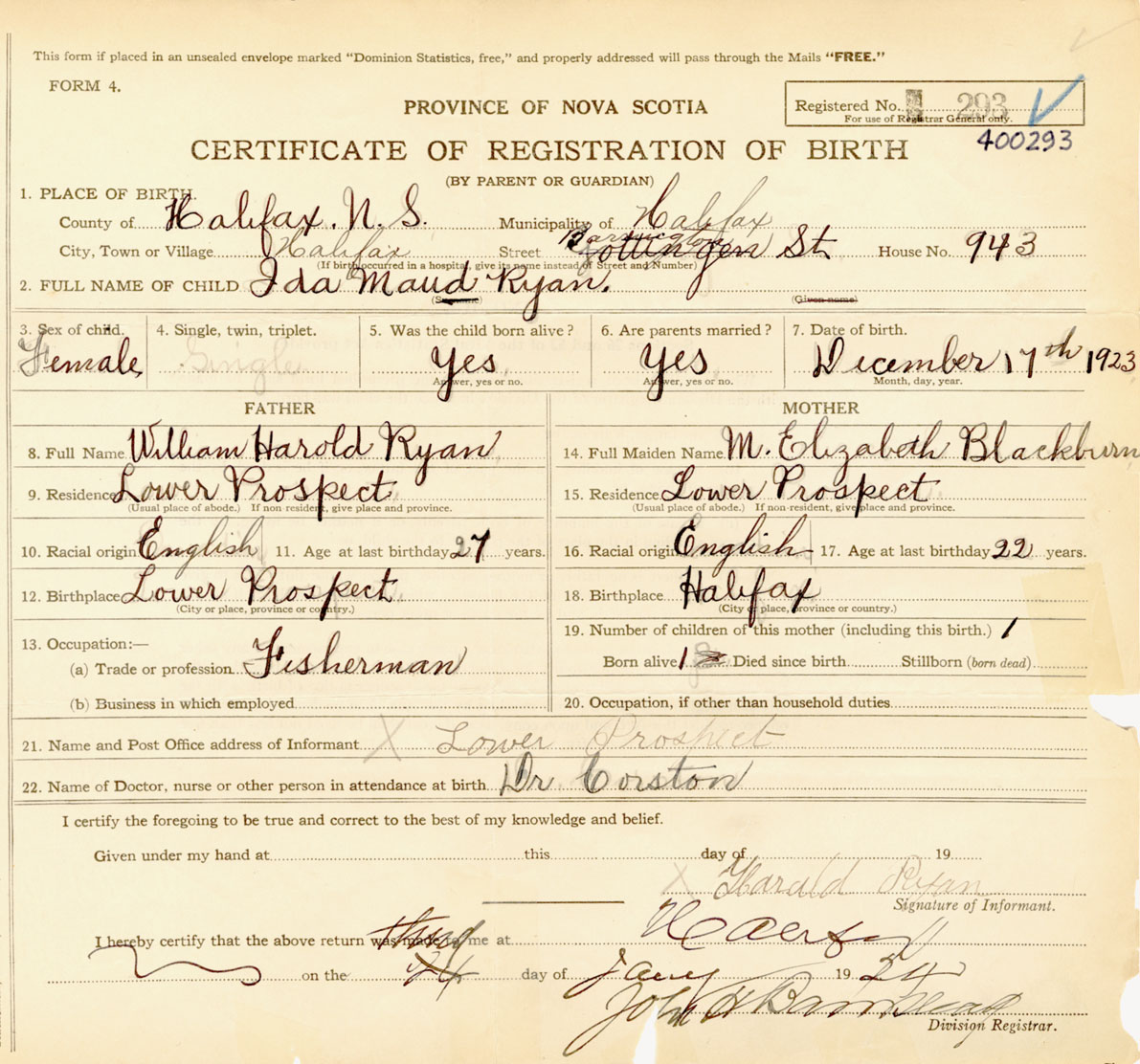 Female Birth Registration: Year: 1923 number: 40000293