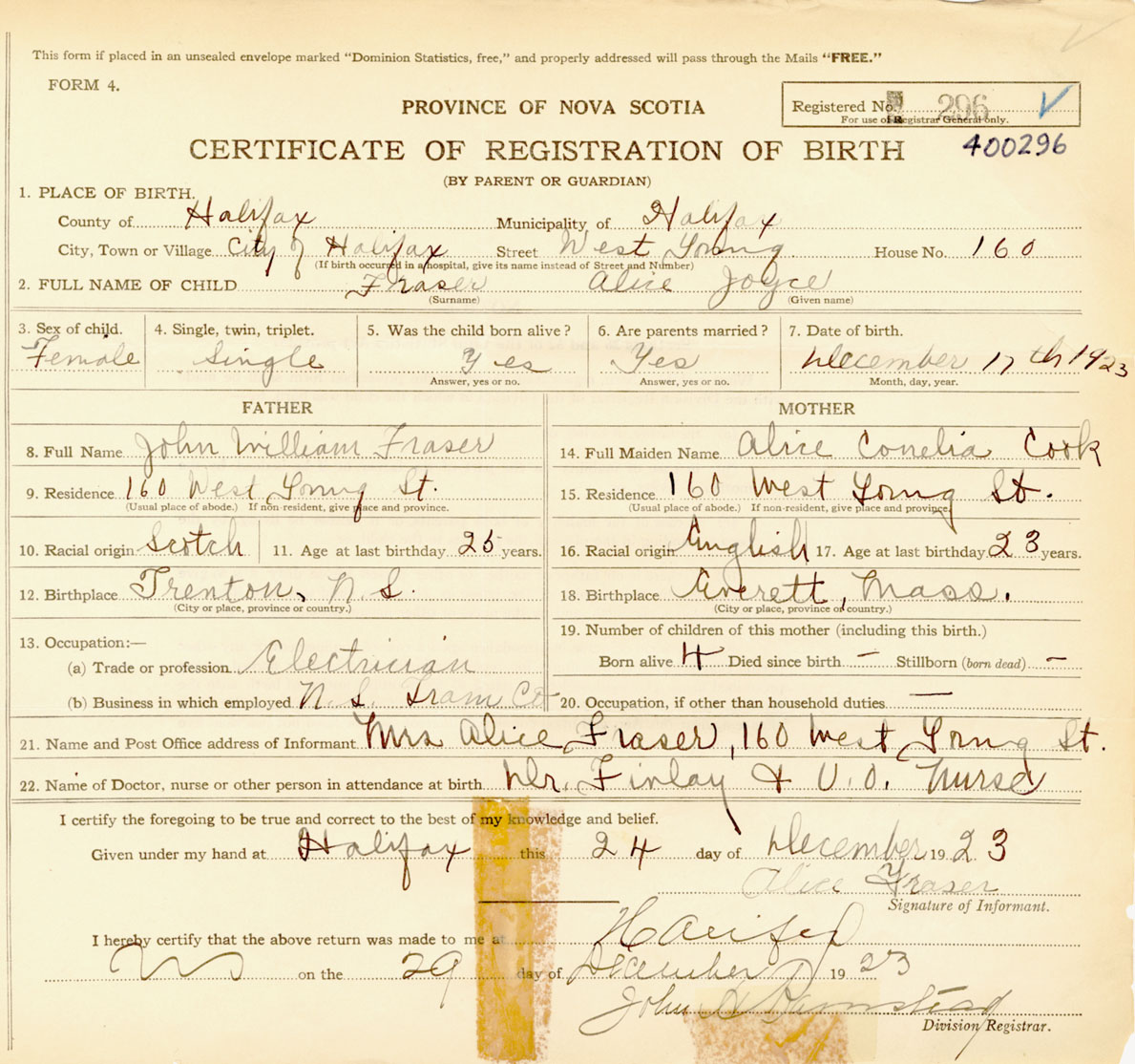 Female Birth Registration: Year: 1923 number: 40000296