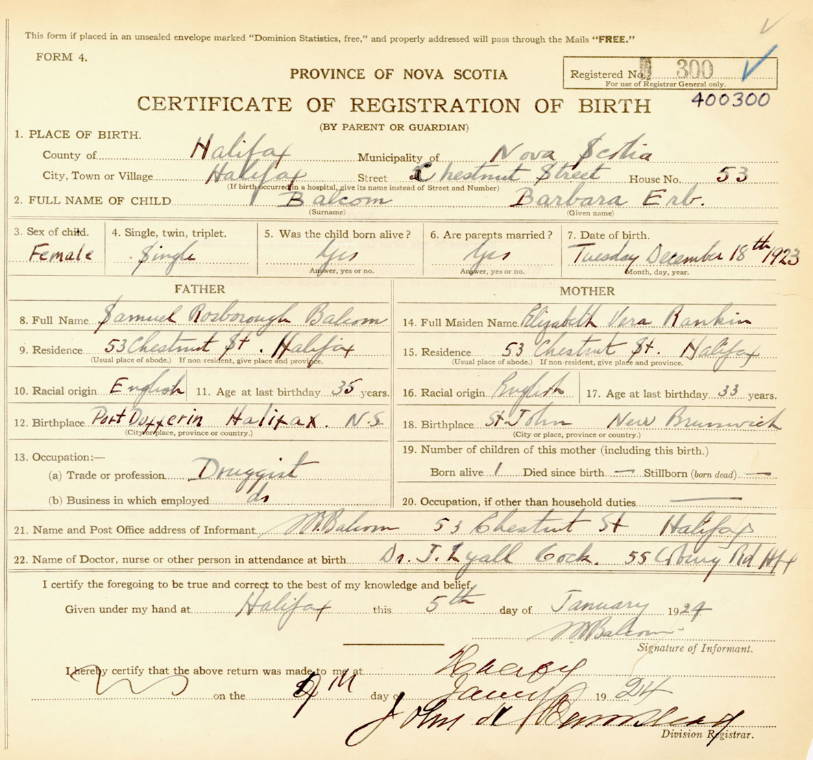 Female Birth Registration: Year: 1923 number: 40000300