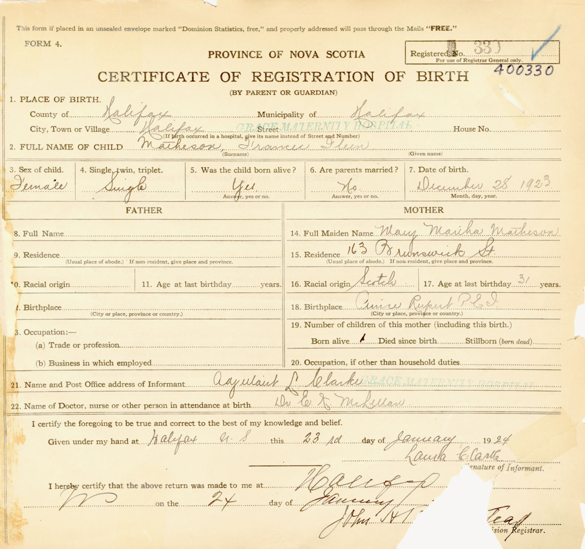 Female Birth Registration: Year: 1923 number: 40000330