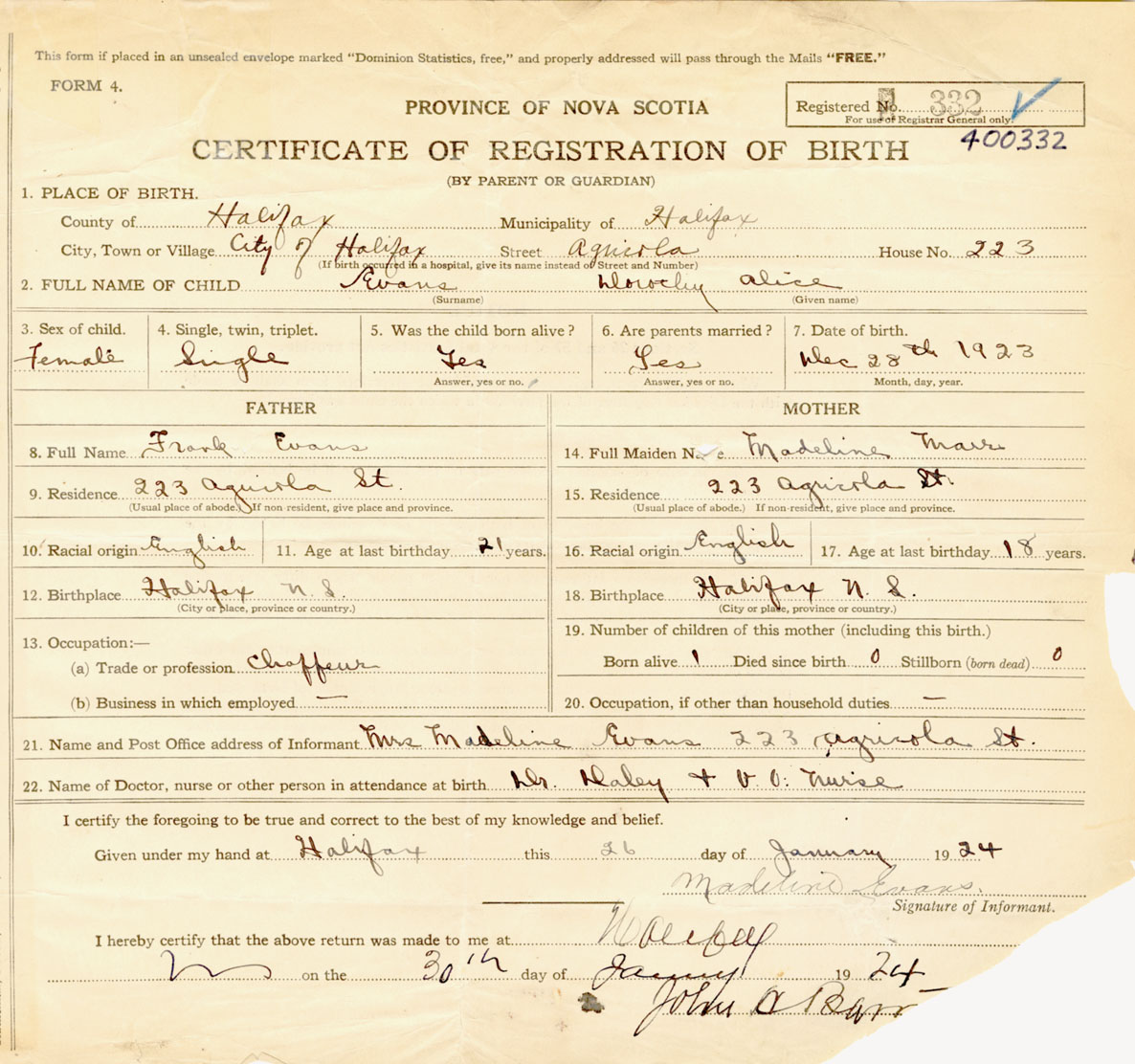 Female Birth Registration: Year: 1923 number: 40000332