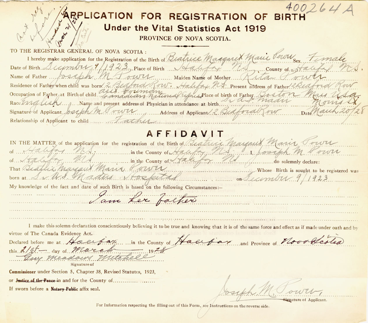 Signature of Applicant Address of Applicant 12 Bedford Row, Halifax Date March 20, 1928