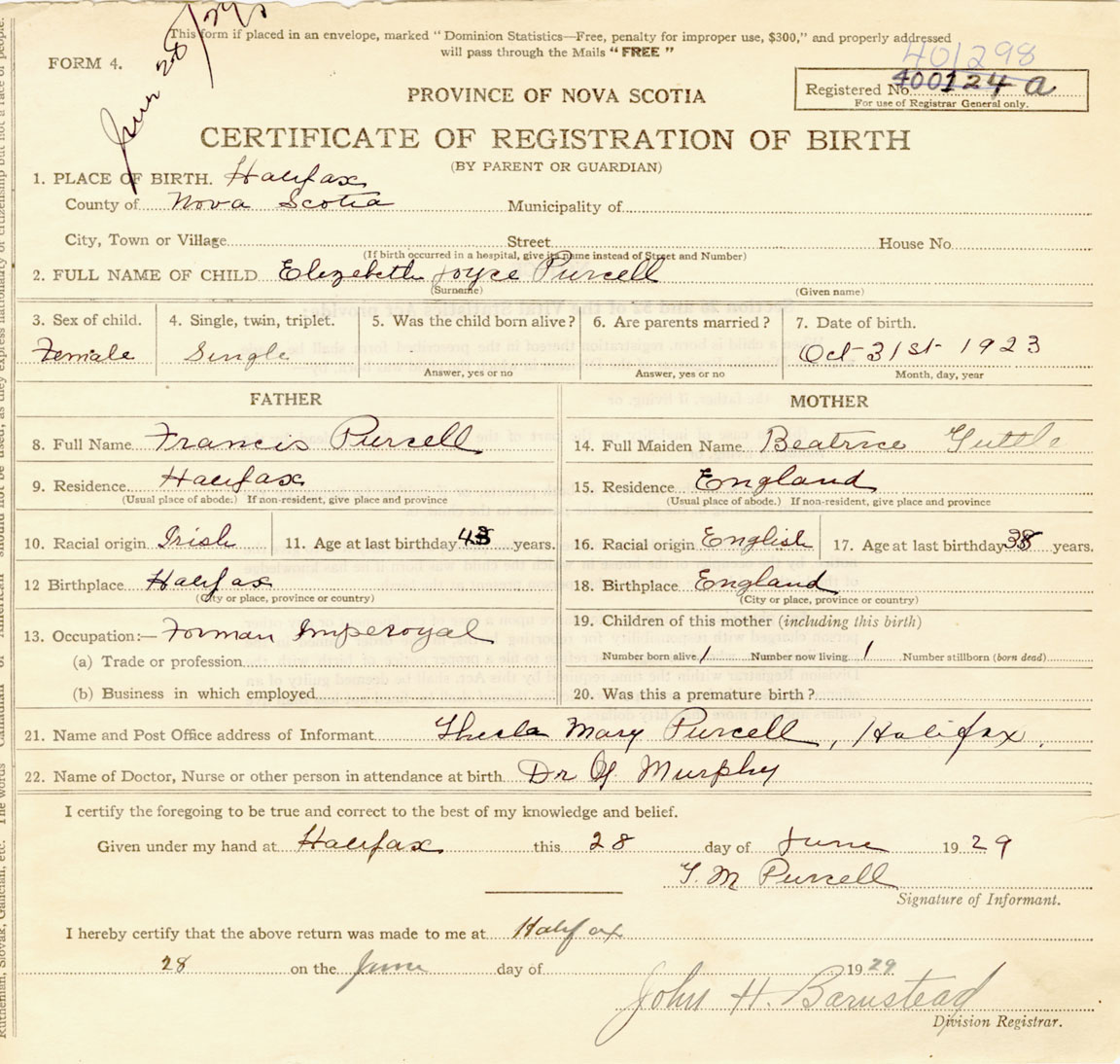 Female Birth Registration: Year: 1923 number: 40100298