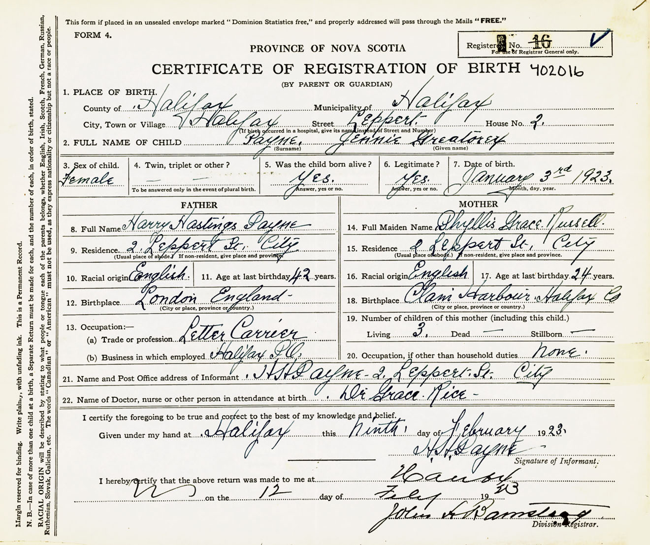 Female Birth Registration: Year: 1923 number: 40200016