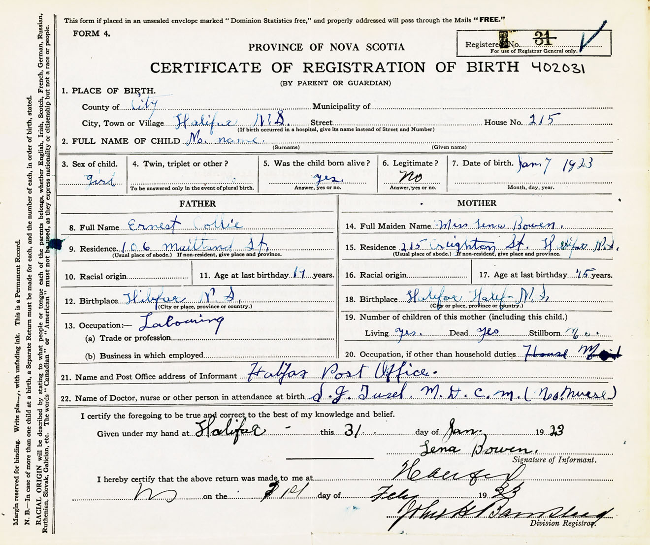 Female Birth Registration: Year: 1923 number: 40200031