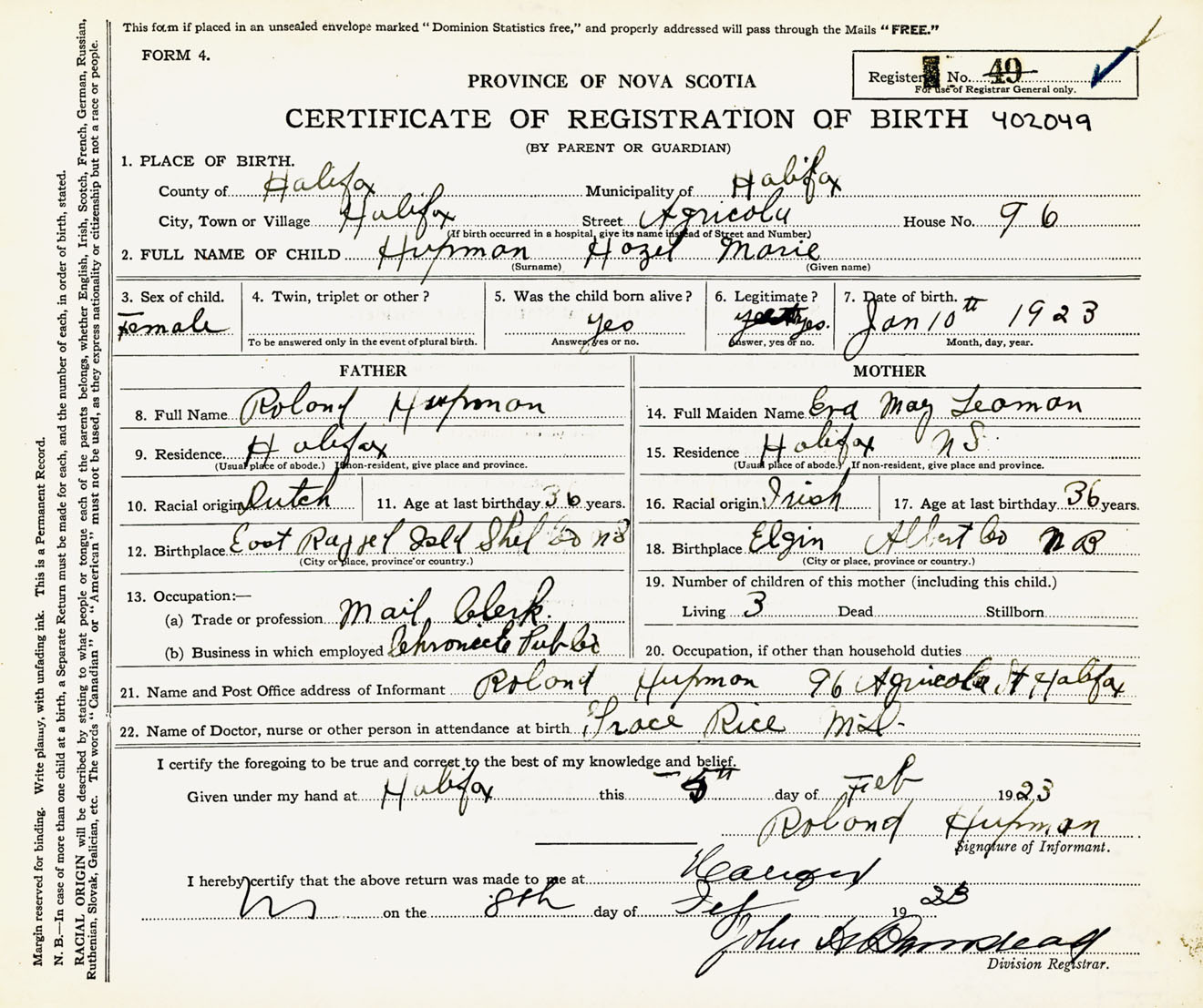 Female Birth Registration: Year: 1923 number: 40200049