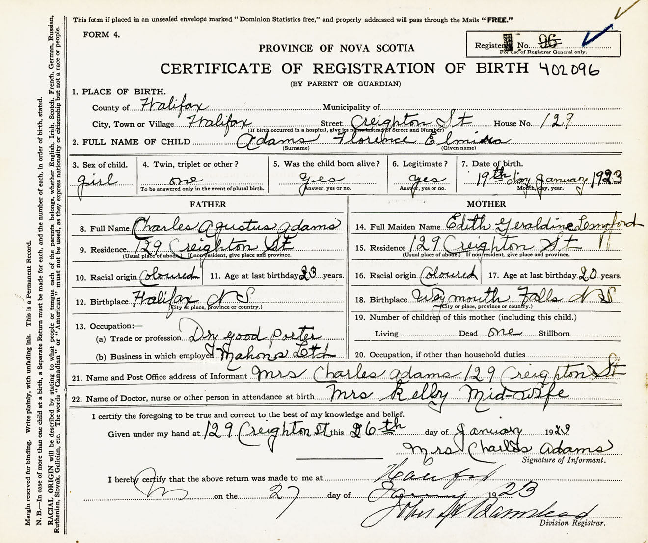Female Birth Registration: Year: 1923 number: 40200096