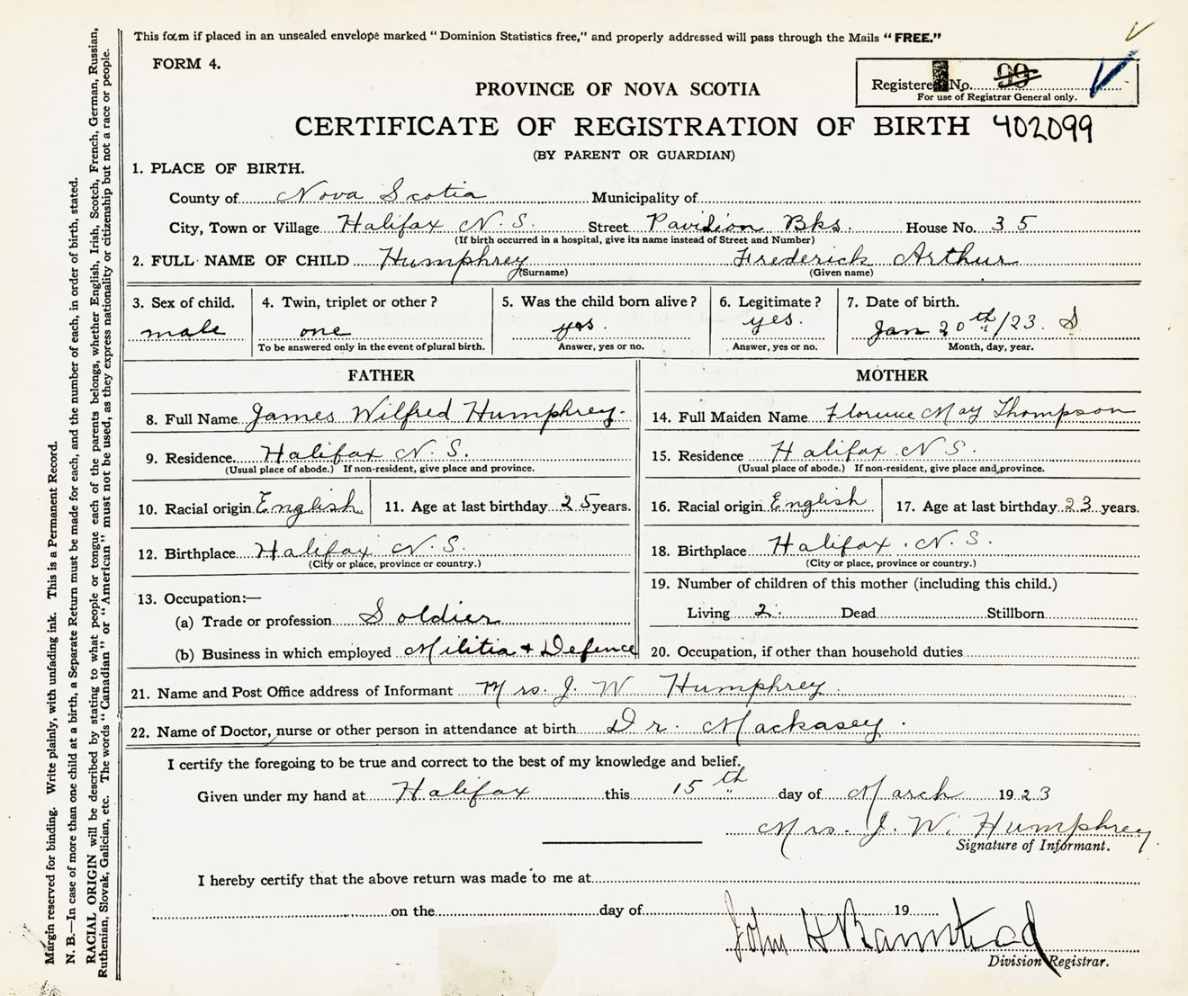 Male Birth Registration: Year: 1923 number: 40200099