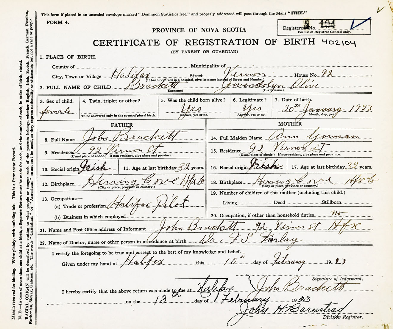 Female Birth Registration: Year: 1923 number: 40200104
