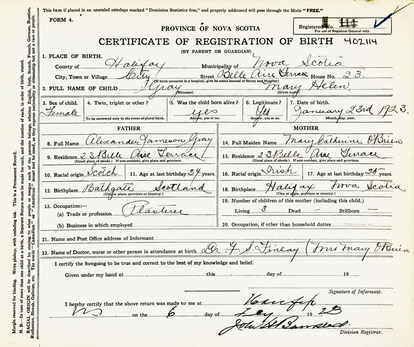 Female Birth Registration: Year: 1923 number: 40200114