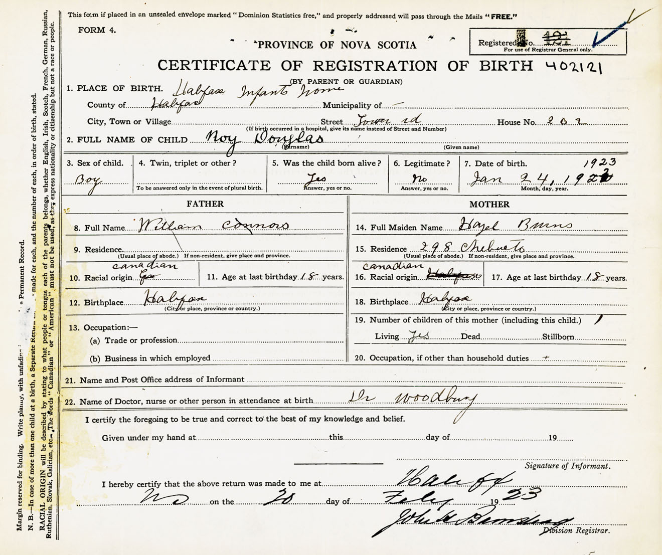 Male Birth Registration: Year: 1923 number: 40200121