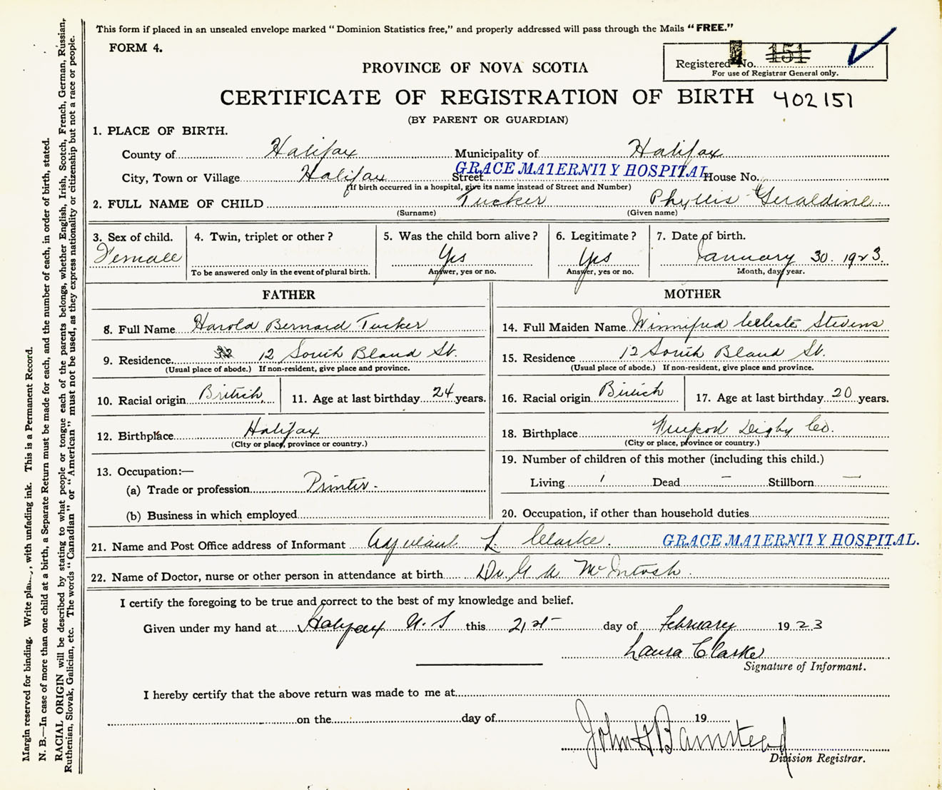 Female Birth Registration: Year: 1923 number: 40200151