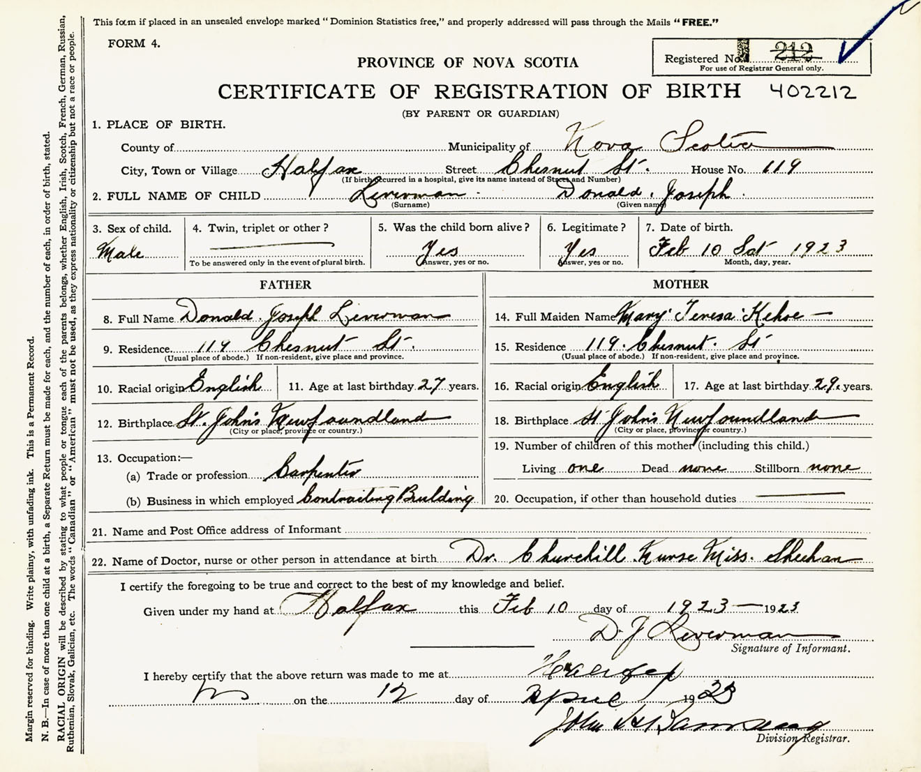 Male Birth Registration: Year: 1923 number: 40200212