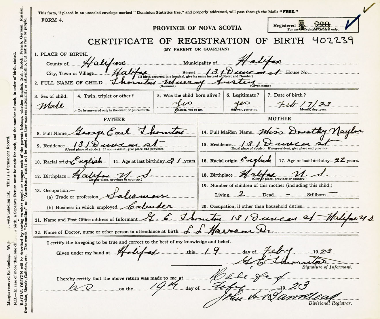 Male Birth Registration: Year: 1923 number: 40200239