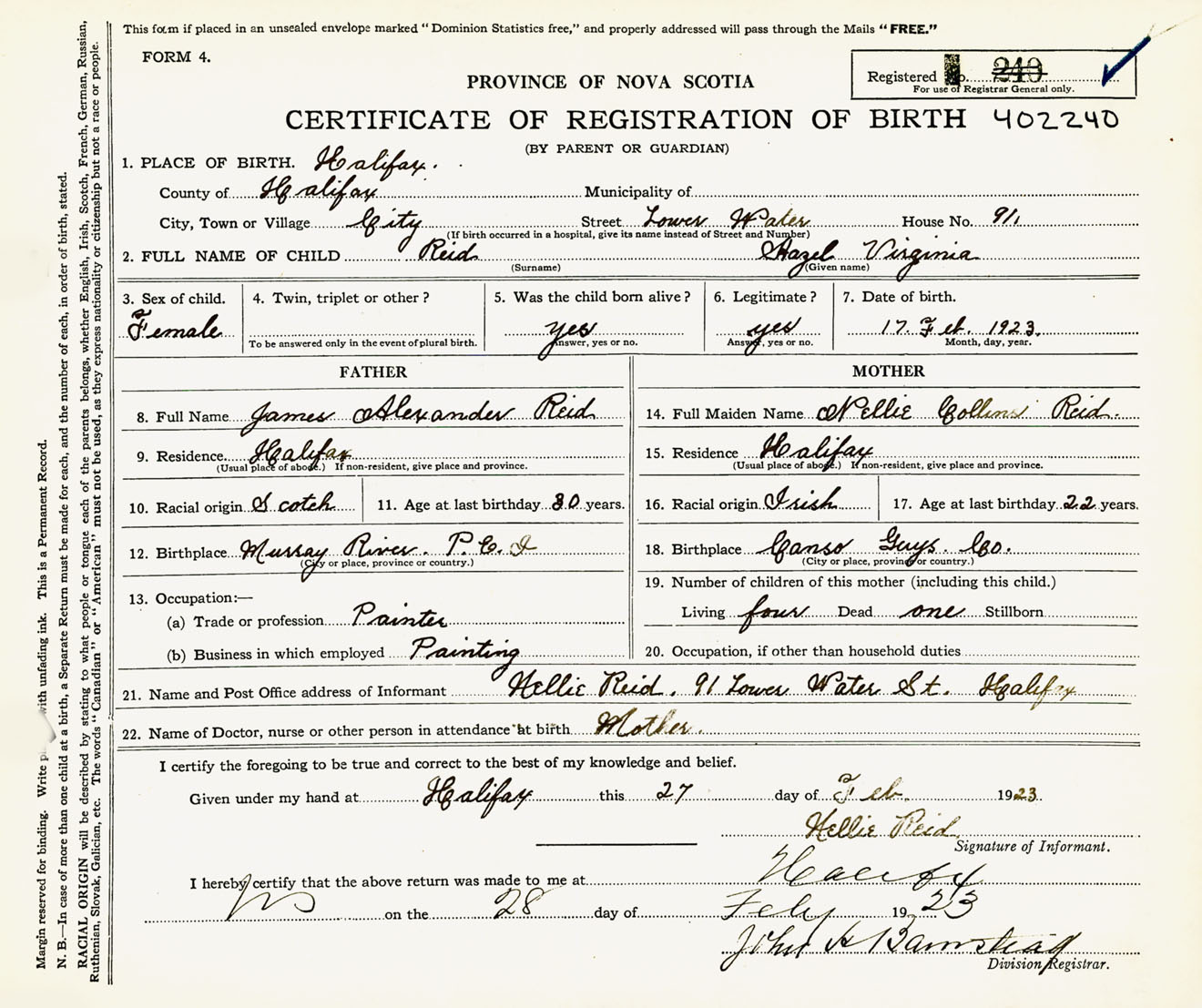 Female Birth Registration: Year: 1923 number: 40200240