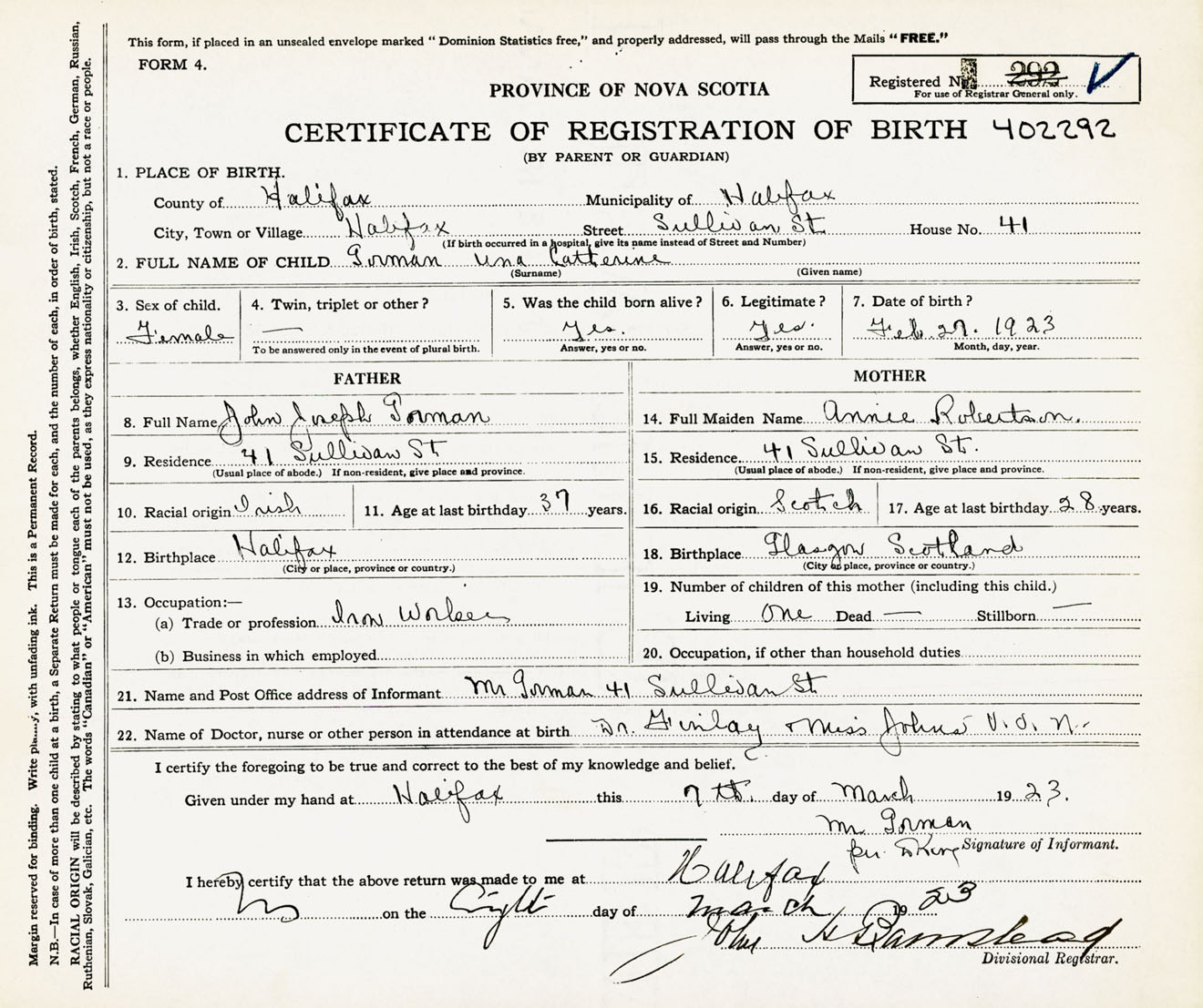 Female Birth Registration: Year: 1923 number: 40200292