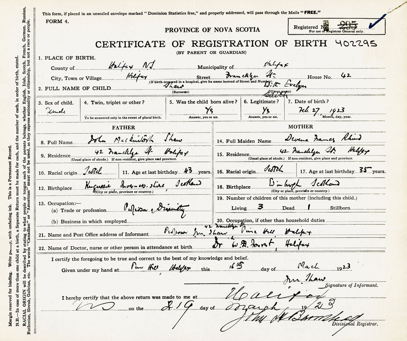 Female Birth Registration: Year: 1923 number: 40200295
