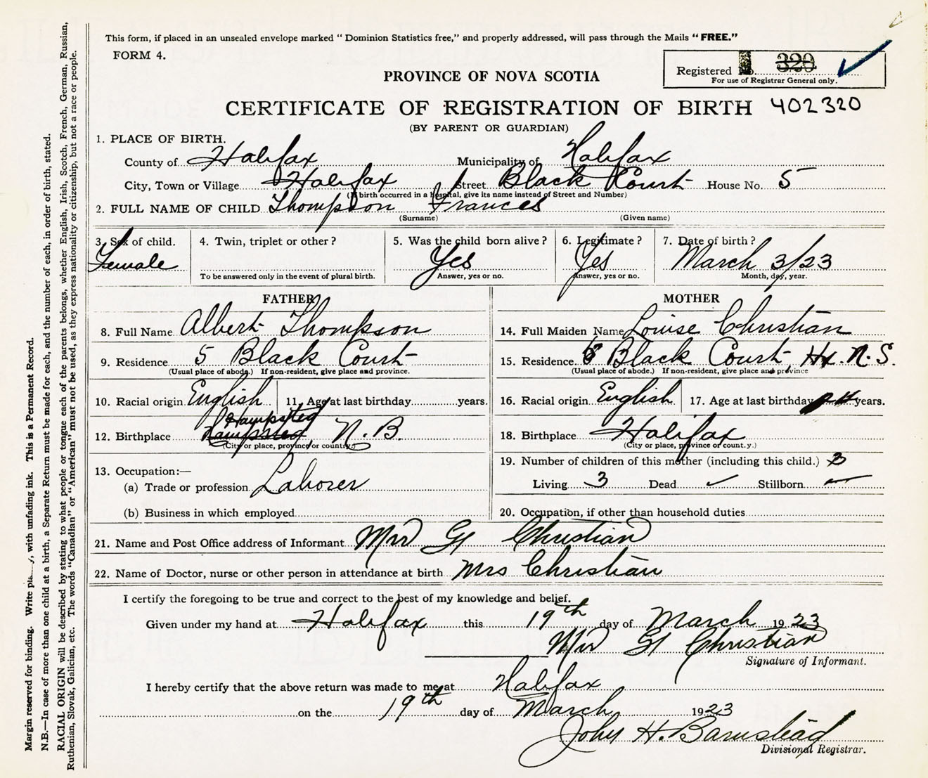 Female Birth Registration: Year: 1923 number: 40200320