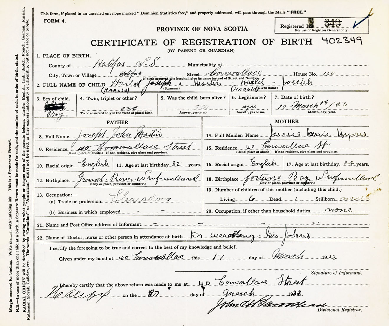 Male Birth Registration: Year: 1923 number: 40200349
