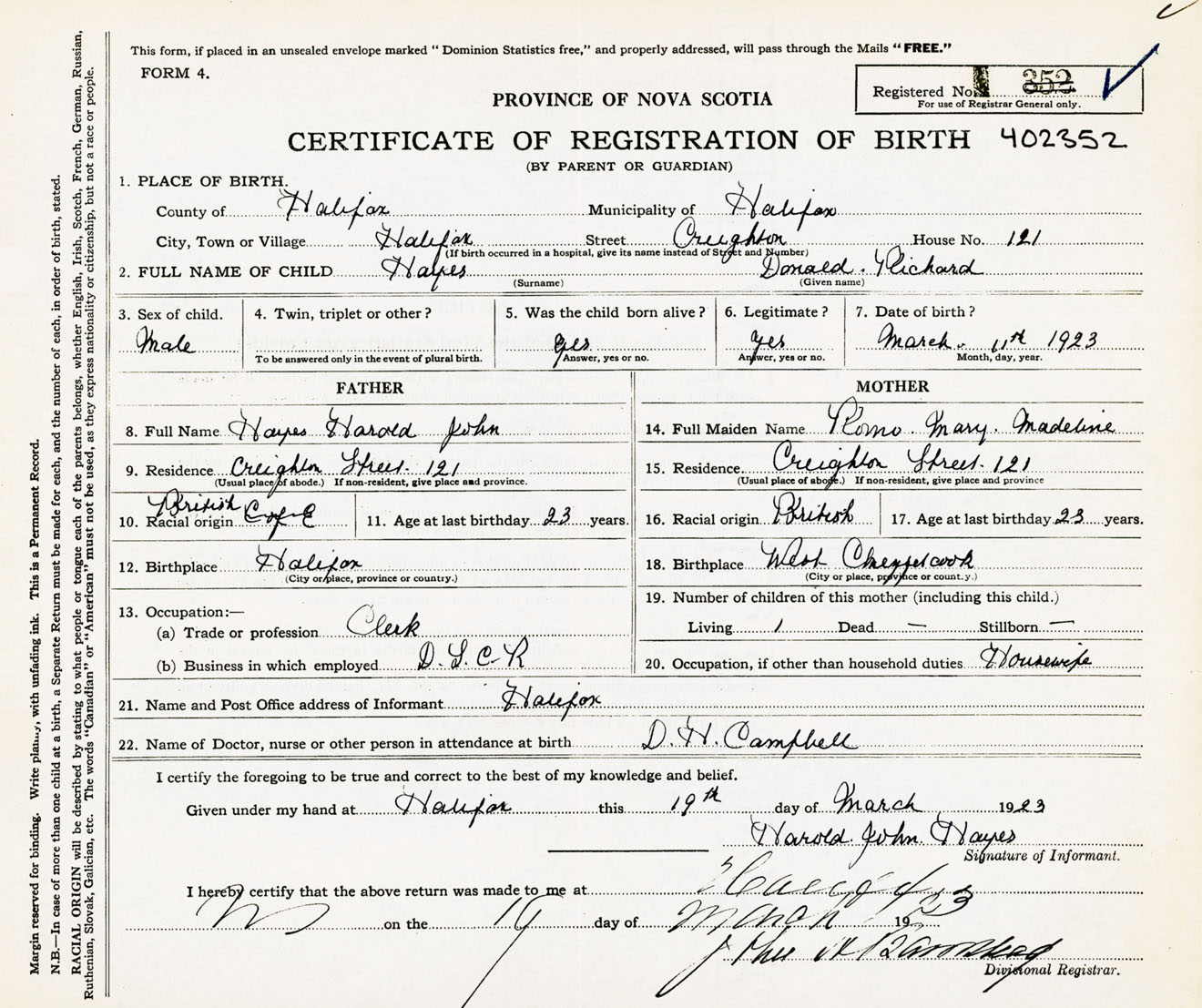 Male Birth Registration: Year: 1923 number: 40200352