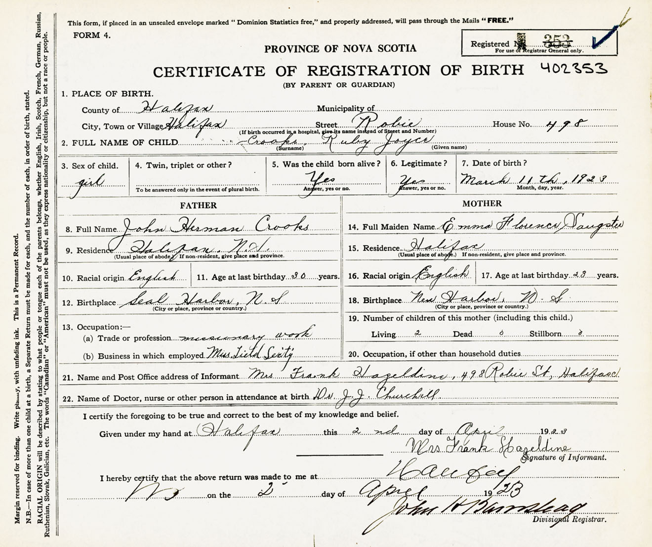 Female Birth Registration: Year: 1923 number: 40200353
