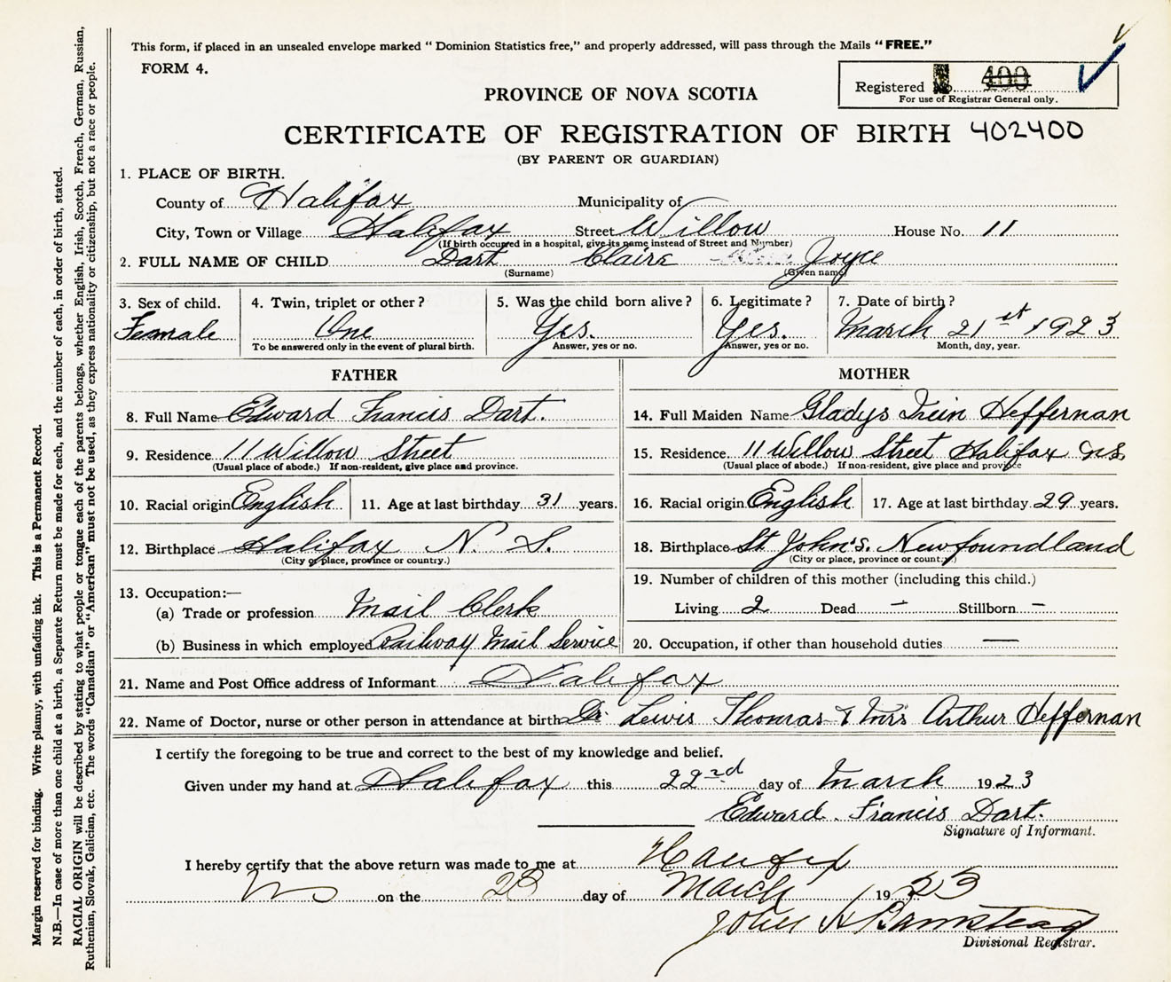 Female Birth Registration: Year: 1923 number: 40200400