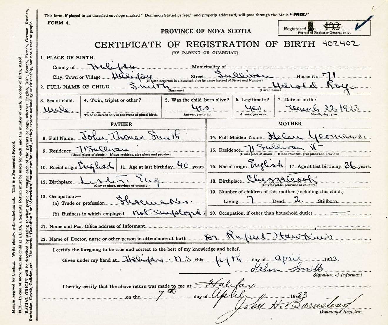 Male Birth Registration: Year: 1923 number: 40200402