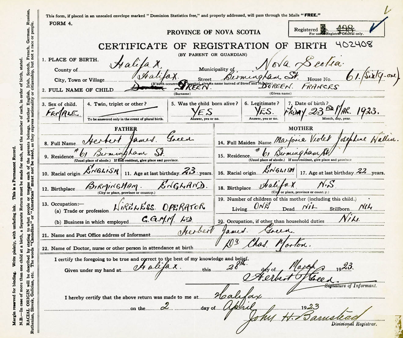 Female Birth Registration: Year: 1923 number: 40200408