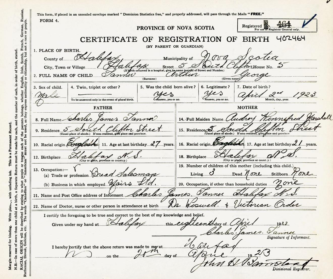Male Birth Registration: Year: 1923 number: 40200464