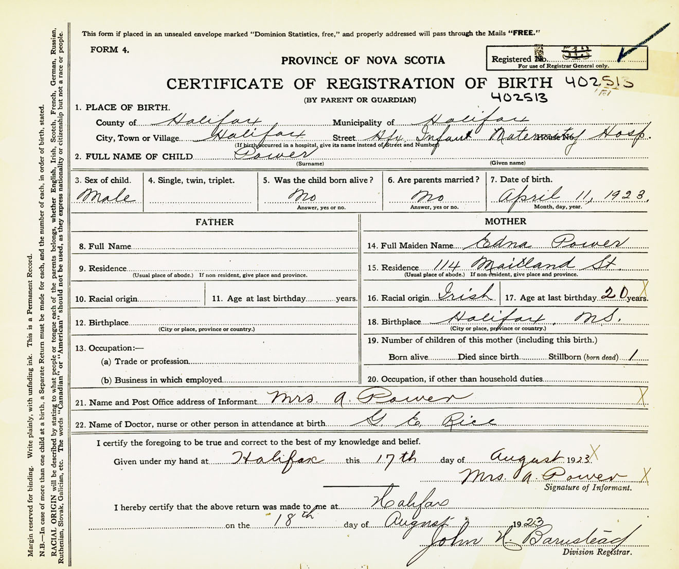 Male Birth Registration: Year: 1923 number: 40200513
