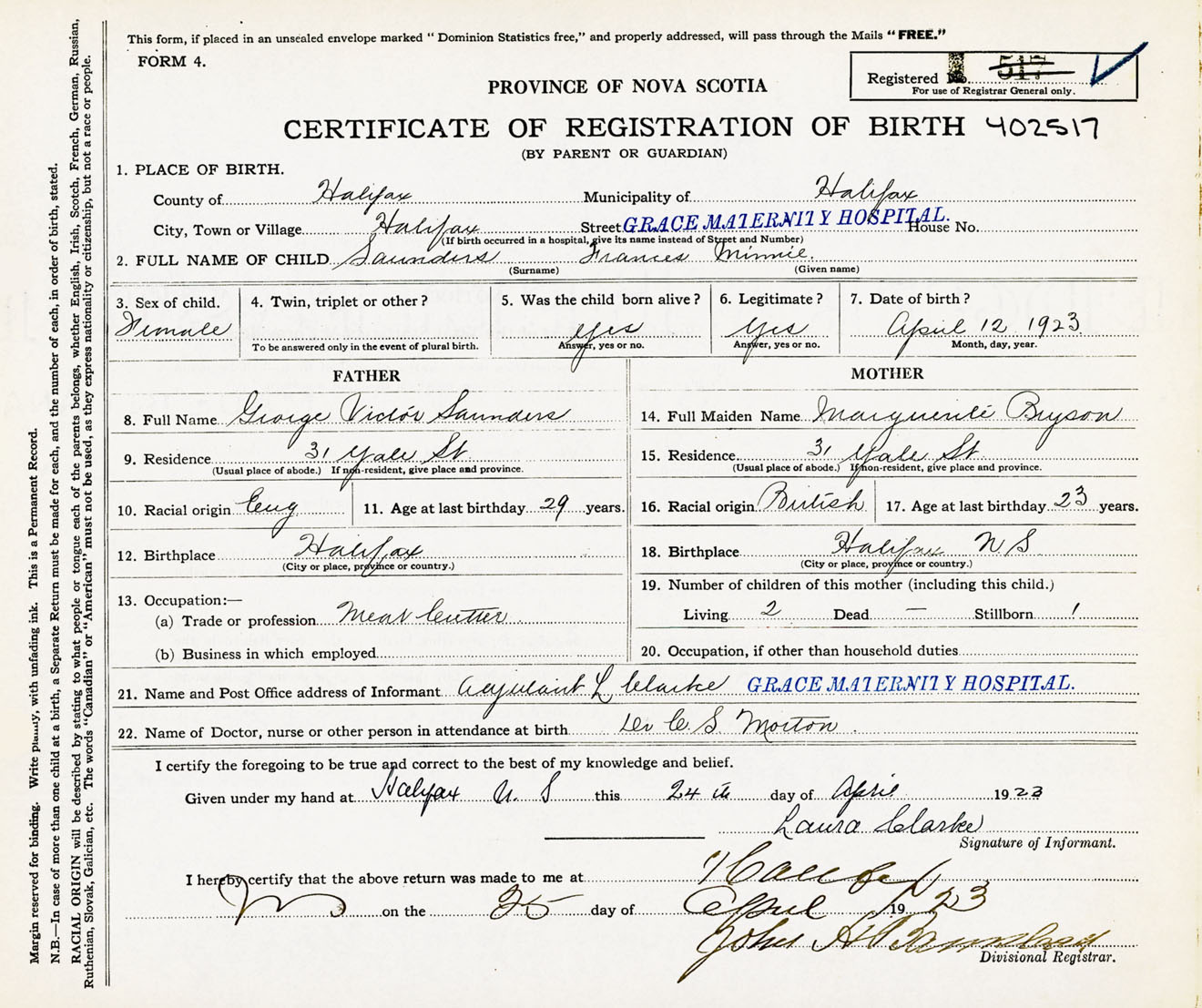 Female Birth Registration: Year: 1923 number: 40200517