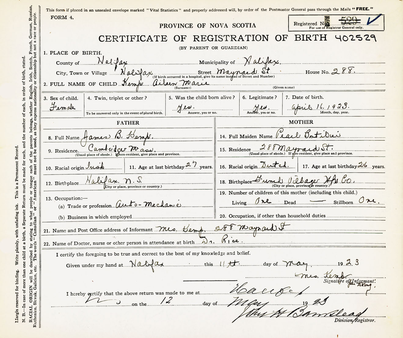 Female Birth Registration: Year: 1923 number: 40200529