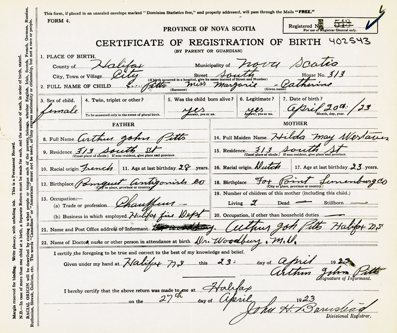 Female Birth Registration: Year: 1923 number: 40200543