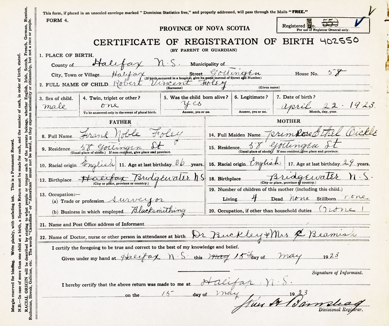 Male Birth Registration: Year: 1923 number: 40200550