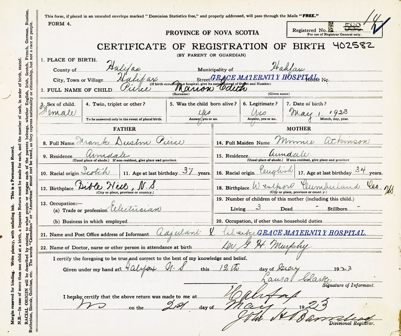 Female Birth Registration: Year: 1923 number: 40200582
