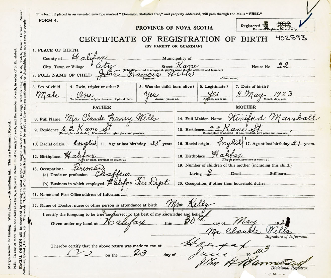 Male Birth Registration: Year: 1923 number: 40200593
